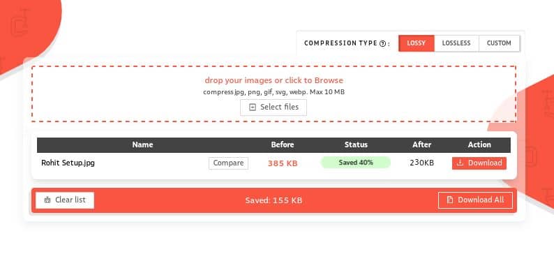 इसके बाद आपको Upload का ऑप्सन मिलेगा उर पर क्लिक करके इमेज को Upload करें बस आपका काम हो गया। इमेज अप लोड होने के बाद स्वतः ही कंप्रेश हो जाएगी। इसमे आपको सारी डिटेल भी देखने को मिलेगी जैसे कितना साइज कम हुआ और कितने % साइज कम हुआ और साथ ही आप इमेज क्वालिटी को भी चेक कर सकते हैं।