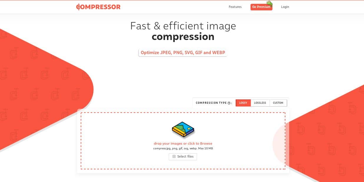सबसे पहले आपको किसी ब्राउजर पर compressor.io ओपेन कर लेना है ओपन करने पर कुछ इस तरह इटरफेस देखने को मिलेगा।