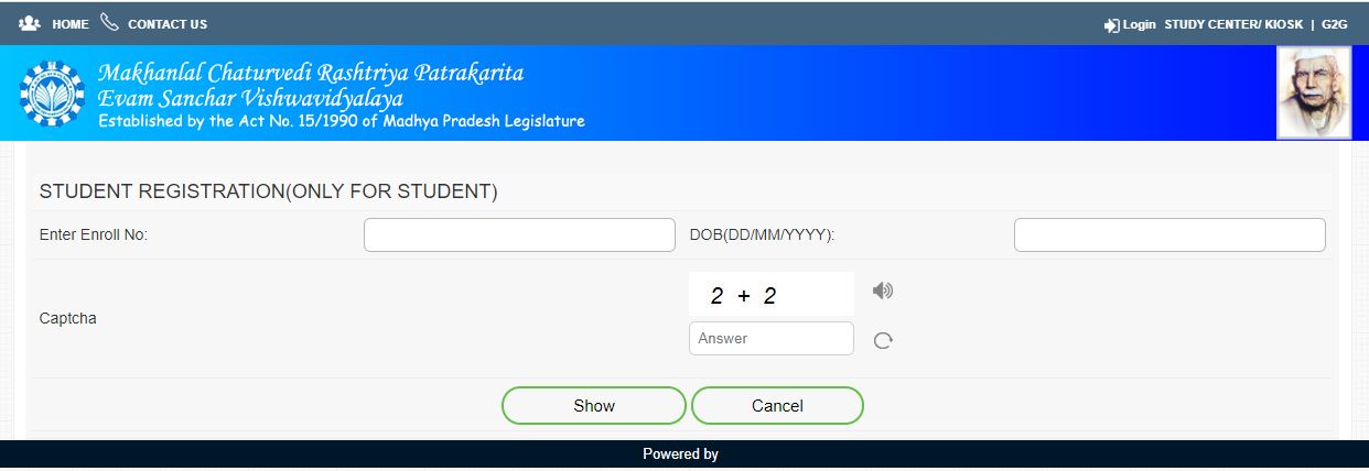अब STUDENT REGISTRATION (ONLY FOR STUDENT) फार्म open होगा इसमें आपको अपना Enrolment no., DOB (Date of Birth) जो मार्क सीट में हो वो डालकर और कैप्चा का Answer देकर के Show पर क्लिक करना हैं ।