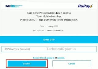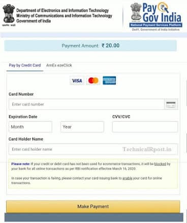 अब debit card से payment करने के लिए Card No. , Expiration Date, CVV/CVC और Card Holder Name डालने के बाद Make Payment पर क्लिक करें । इसके बाद आपके मोबाइल पर एक OTP आएगा उसे यहाँ डालकर Submit कर दें । जब तक Payment done न हो जाए और Payment Acknowledgement no. न मिले तो आपको यह पेज बैंक या रिफ्रेश नही करना है ।
